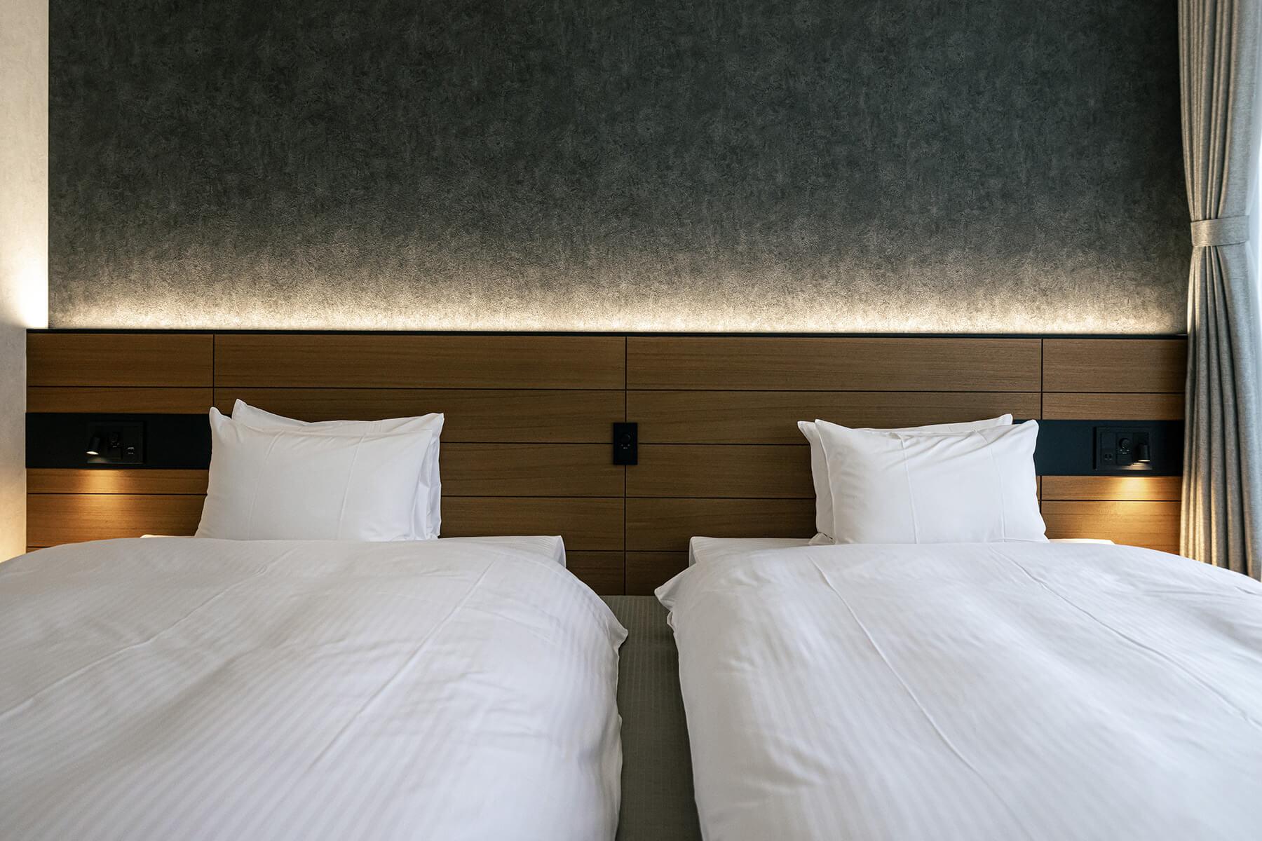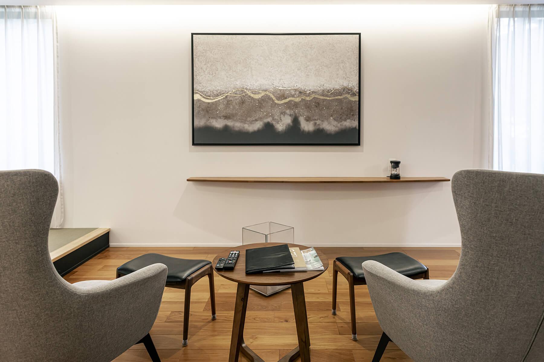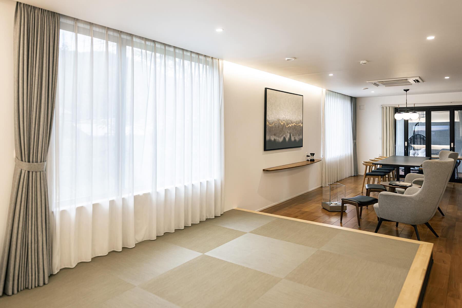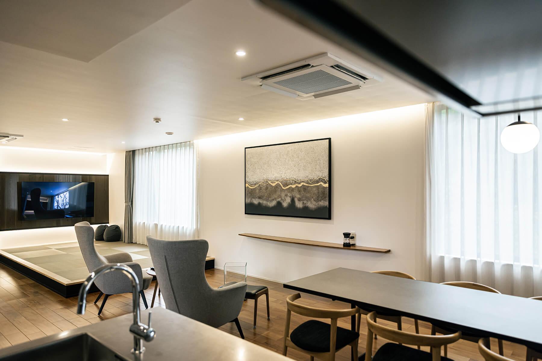 平家造りのヴィラには2つの寝室と広々としたリビングダイニングスペースを備えます。リビングの小上がりに布団を敷けば、最大で8名まで宿泊が可能。家族や友人同士といったさまざまな旅のかたちに寄り添います。室内はウッドを基調にした上品な色合いで統一され、窓から差し込む光と心地よく調和します。炎のゆらぎを室内で楽しめるEco Smart FireやBALMUDAのスピーカーなど、快適な時間を演出してくれるアイテムが充実しているのもうれしいポイントです。