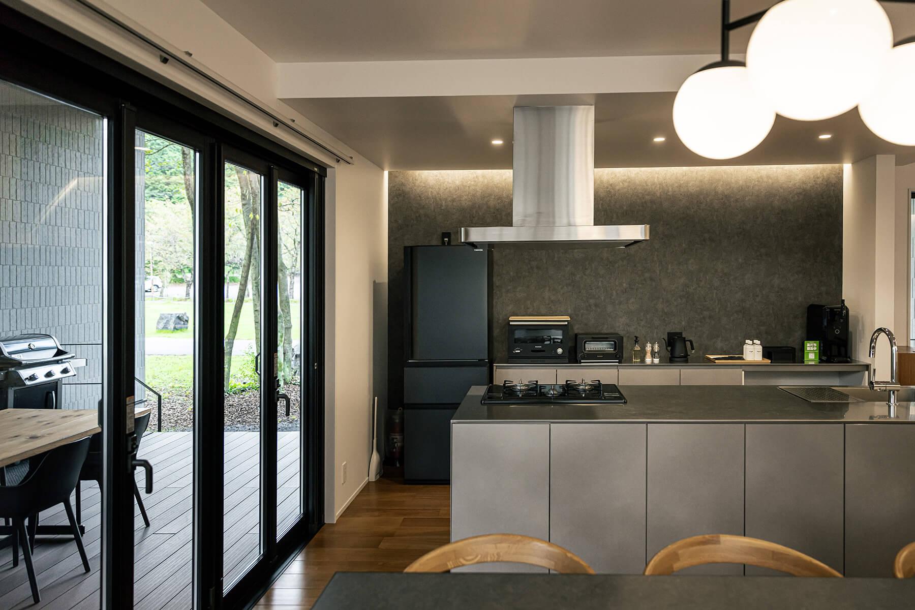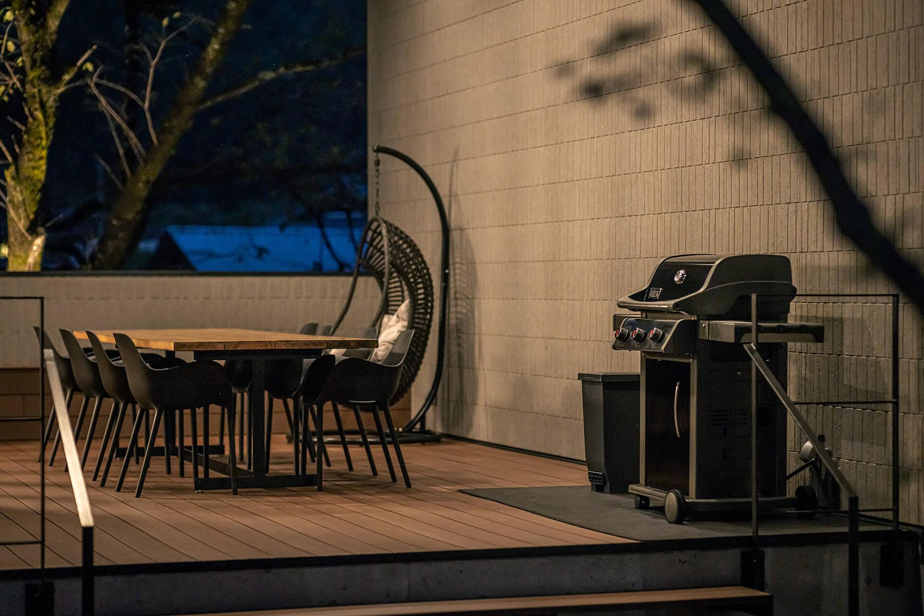 システムキッチンには、調理道具や食器が一式揃い、食材を持ち込んでのクッキングも自在。ダイニングとつながる屋根付きのテラスには本格的なBBQグリルが備わり、天候を気にせずアウトドアで時間を過ごすこともできます。事前に依頼しておけば肉や野菜などの食材を用意してもらうことが可能で、BBQやしゃぶしゃぶ、すき焼きなども楽しめます。